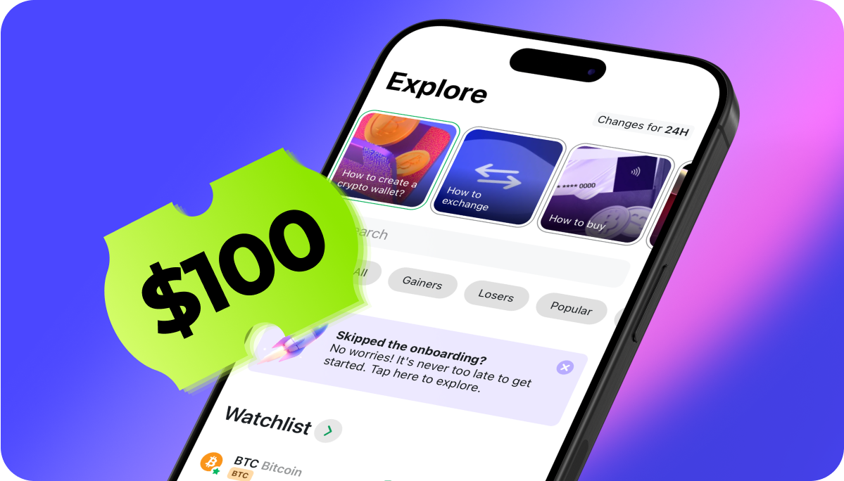 When you download and sign up in the Changelly app, we'll automatically give you a $100 bonus to cover service fees. You won't see a $100 balance at first, but don't worry, it kicks in automatically the moment you start using services in the app.