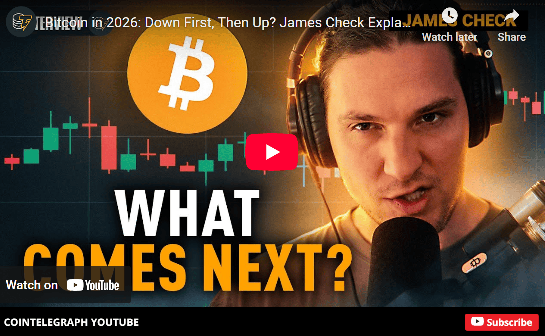 Most Bitcoin outlooks for 2026 boil down to slogans; the on-chain data tells a more complicated story. In this interview, we sit down with Glassnode lead analyst James Check to map what the current market structure actually implies for the next two years. He walks through sell-side dynamics, ETF behavior, sovereign interest and how different cohorts are cycling in and out of profit. His base case is uncomfortable for both extremes: more downside and chop before a sustainable move higher, rather than a straight line in either direction. If you're still trading off headlines, this is a reminder that the chain is starting to price a path where pain comes first, then upside. | | | | | | | | | —Written by Monica Hutchison | | | | 4.6 million people follow us on social media. You should too. | | | | | | | | | Cointelegraph Consulting Limited | | 20/F, Strand 50, 50 Bonham Strand Sheung Wan, Hong Kong Hong Kong | | | You received this email because you signed up on our website. | | Download our official app: | | | | | | | | | | | | | | | |
