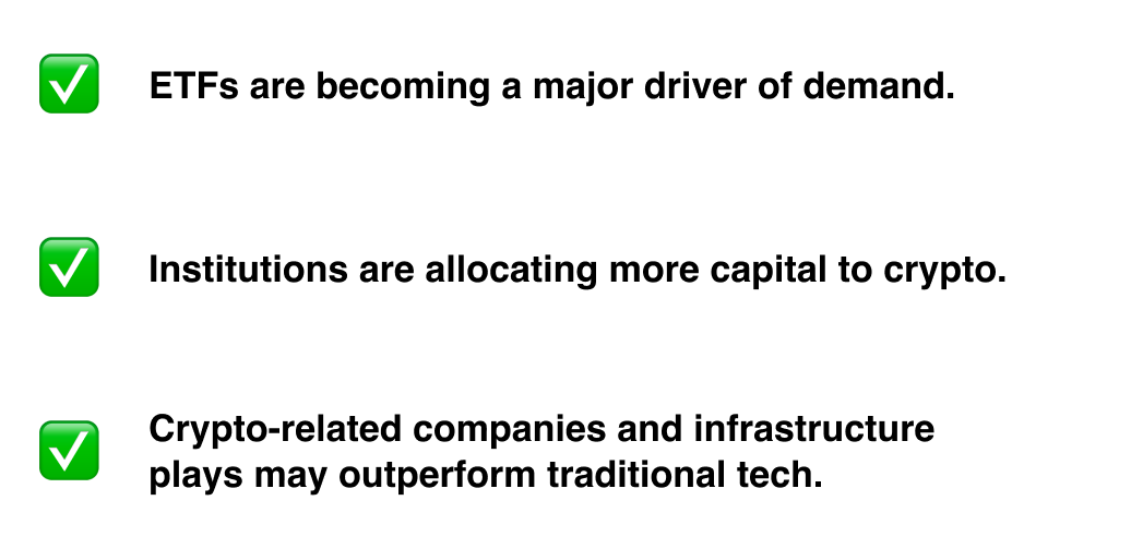 | | Here's What 2026 Is Setting Up | | As we start looking towards 2026, the crypto market is shaping up to be very different from what we've seen in past cycles. More institutions are involved, ETFs are changing supply-and-demand dynamics, and a few major networks are clearly pulling ahead. | | Here's a quick, investor-friendly breakdown of some of the most promising crypto assets and trends heading into 2026. | | | | Bitcoin (BTC): Still the Anchor | | Bitcoin continues to solidify its role as the backbone of the crypto market. - Institutional demand is growing fast, especially through spot ETFs